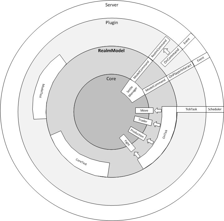 Das Model ist eigenständig testbar . Es bildet die einzelnen Objekte ab und realisiert die Beziehungen der Objekte untereinander. Dies ist ein Automat, der von außen mit Signalen und Werten stimuliert wird. Das Model läuft in Runden ab. Nach Ablauf der Anzahl von Tagesrunden wird die Produktion ausgelöst und pro Settlement berechnet. Zur Berechnung der Produktion gehören die hergestellten Produkte von Building, wie auch die Anzahl der Siedler. Die Anzahl der Siedler wird durch eine Geburtenrate und eine Sterberate beeinflußt. Nach Ablauf der Anzahl von Monatsrunden wird die Tax berechnet und auf die Townhall des Settlement gebucht.